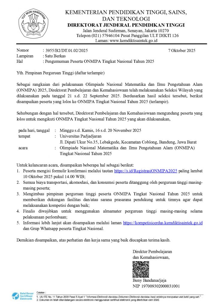Selamat dan semangat berjuang dalam ajang Olimpiade Nasional Matematika dan Ilmu Pengetahuan Alam – Perguruan Tinggi (ONMIPA-PT) di Tingkat Nasional. Semoga diberikan kelancaran dan memperoleh hasil yang terbaik.