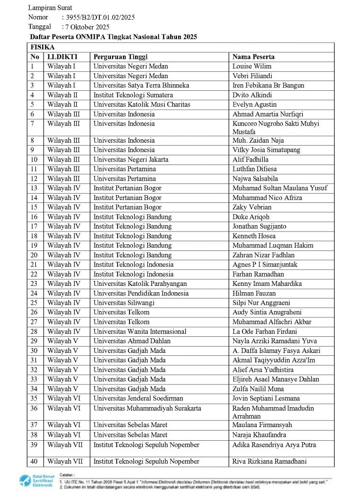 Salah satu mahasiswa Departemen Fisika atas nama Rani Anggraini (NIM.23033029) dari Prodi Pendidikan FIsika berhasil lolos Seleksi Wilayah ONMIPA-PT Tahun 2025 dan lanjut ke ONMIPA-PT Tingkat Nasional yang akan dilaksanakan di Universitas Padjadjaran tanggal 16-20 November 2025.