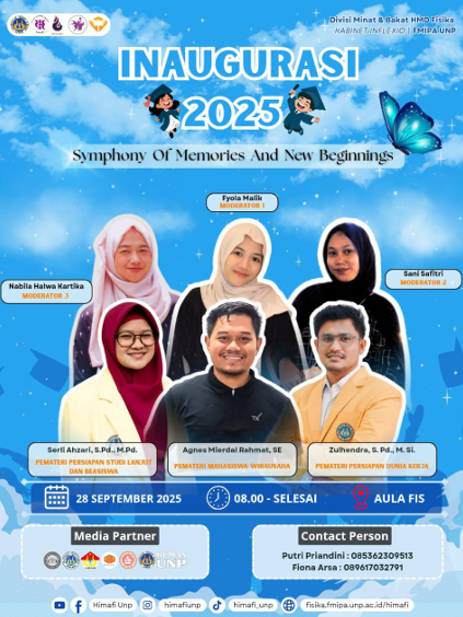 Sebuah simfoni indah tercipta ketika kenangan masa lalu bertemu dengan harapan masa depan. Itulah suasana yang menyelimuti Aula Fakultas Ilmu Sosial (FIS) Universitas Negeri Padang pada Minggu, 28 September 2025 lalu. Divisi Minat dan Bakat HMD Fisika FMIPA KM UNP sukses menggelar acara akbar Inaugurasi Fisika 2025.